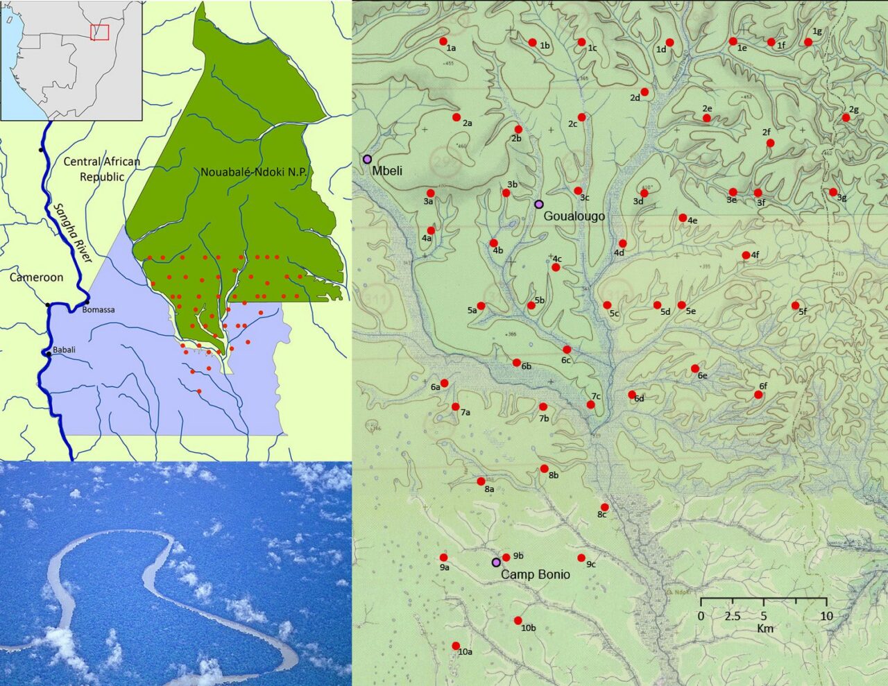 The landscape is lowland tropical rainforest comprised of a number of forest types including mixed semi-evergreen forest, monodominant Gilbertiodendron forest, and swamp forest. Fifty acoustic units were placed using a stratified random sampling method on a grid of 25 km2 cells.
