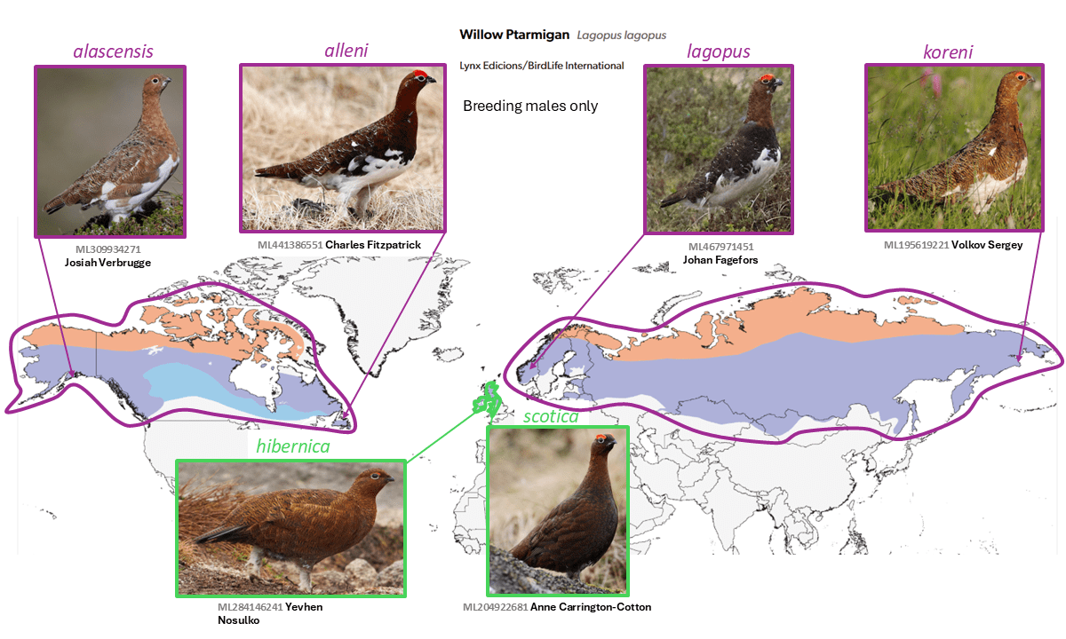 Long treated as members of the highly polytypic Holarctic Willow Ptarmigan Lagopus lagopus (Linnaeus, 1758), the two (or one, depending on taxonomy adopted) taxa in the British Isles, scotica (Latham, 1787) and hibernica (Kleinschmidt, 1919), are the only ones with wholly dark wings and no molt into a white winter plumage. Despite their very wide distribution, including on islands, all the other subspecies are fairly similar in plumage and molts. In fact, even Peters (1934) treated scotica and hibernica as separate species. While these morphological aspects were long argued to be of only subspecific importance (as treated by e.g. Wolters 1976), genomic data show that scotica and hibernica form a monophyletic, fairly well-diverged clade (Quintela et al. 2010, Kozma et al. 2019, Sangster et al. 2022). Nevertheless, they appear to be similar vocally to taxa of Lagopus lagopus, although a vocal analysis should be carried out. On balance, the evidence is deemed by AviList Core Team (2025) and NACC (Chesser 2025, 2025-B-10; Chesser et al. 2025) to support specific status for Lagopus scotica, while the recognition of subspecies hibernica requires further study, as it is currently recognized by eBird/Clements (v2025) but not by AviList Core Team (2025).
