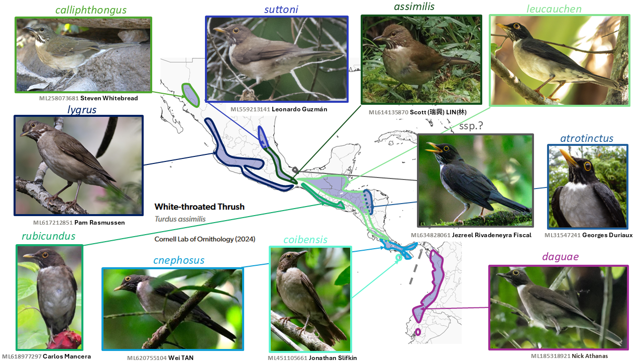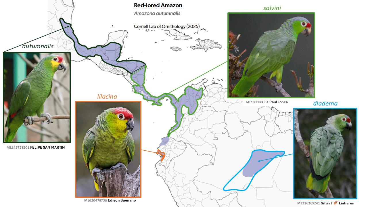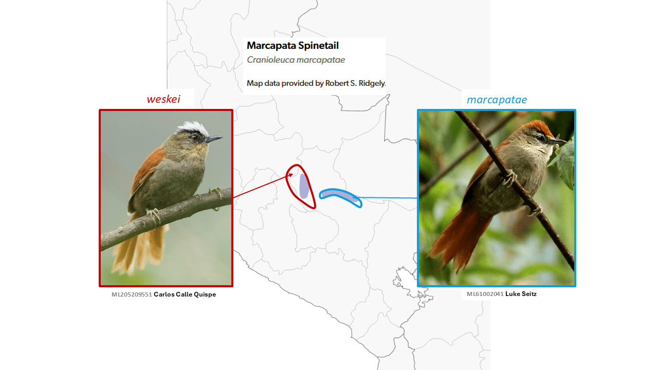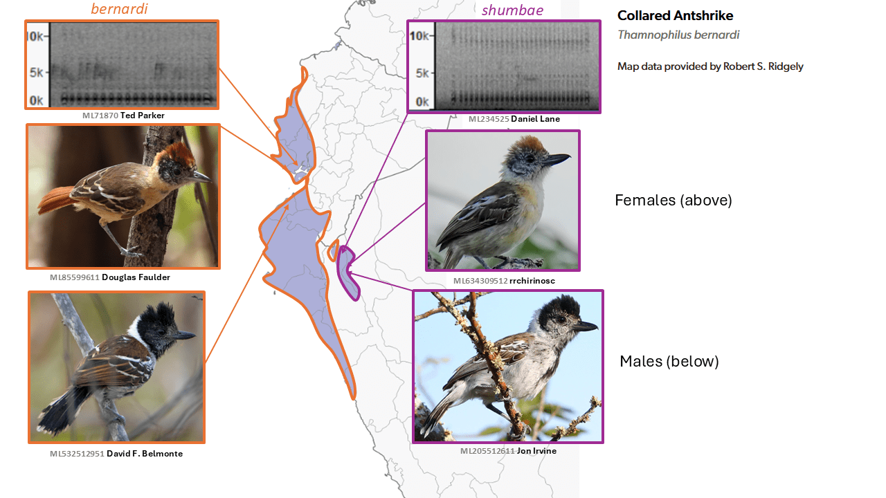 During the AviList voting process, strong differences in typical call notes were detected, and this and other striking vocal differences that evidently do not overlap were elaborated upon by P. Boesman in Remsen’s 2024 SACC proposal. The combined evidence from plumage and vocalizations has led both SACC and AviList Core Team (2025) to consider whitelyi a distinct species.