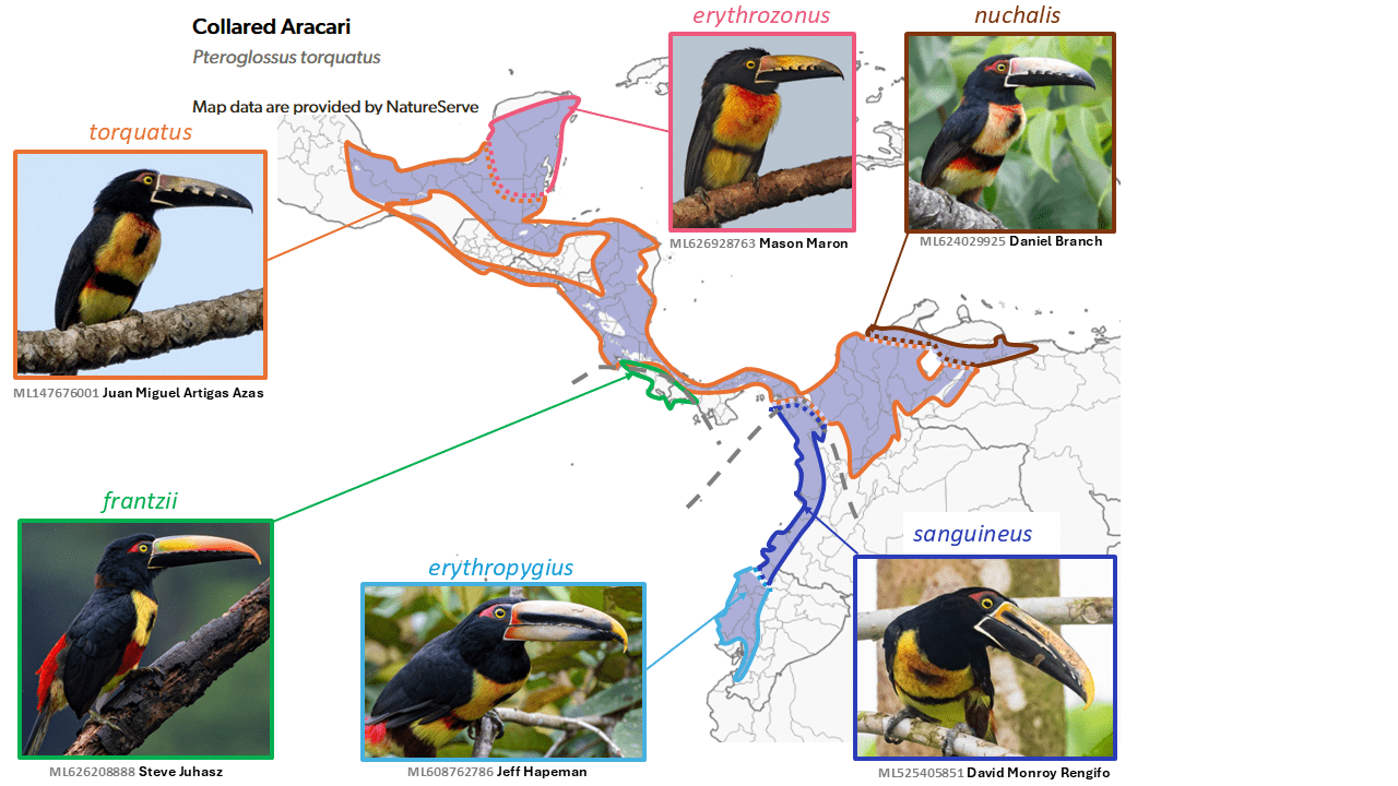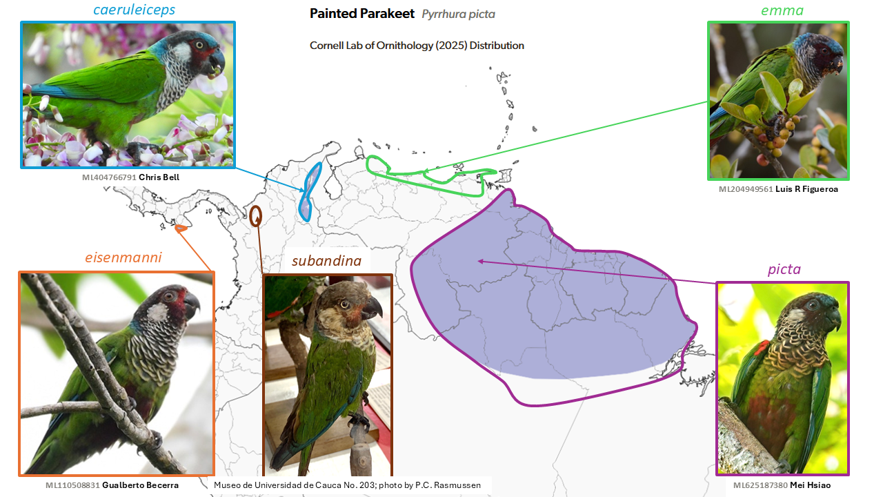 - subspecies elaeoprorus, caucae, spodionotus, comptus, latinuchus, chugurensis, baroni, and yariguierum
