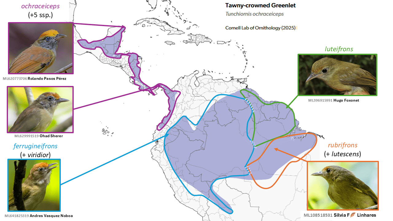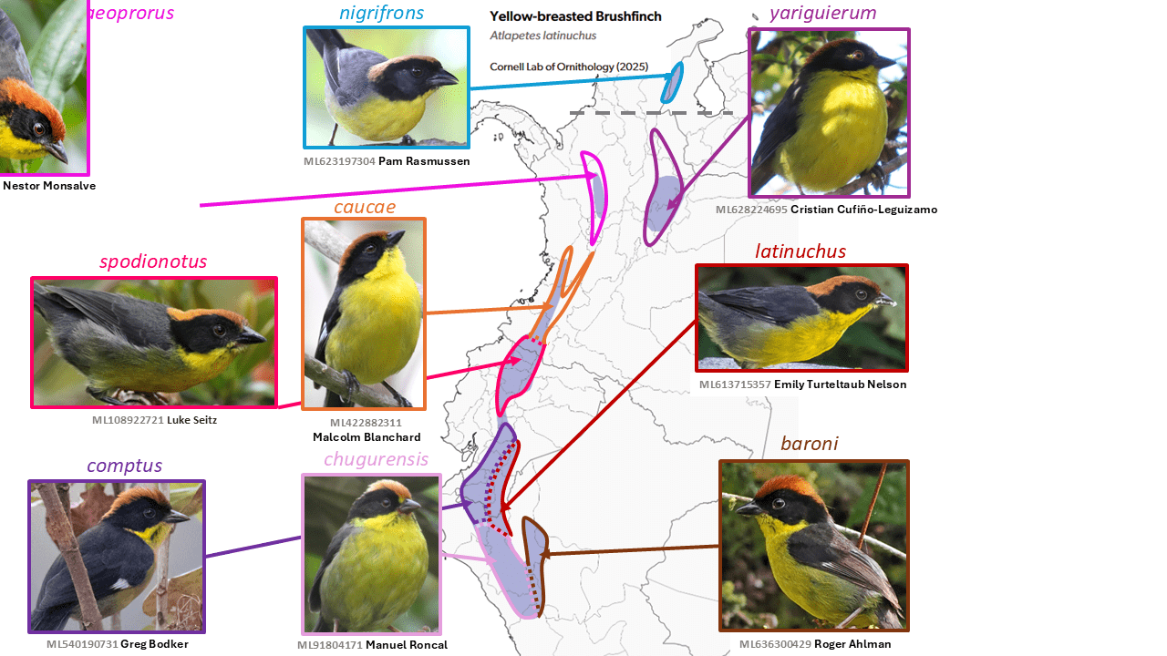 - subspecies elaeoprorus, caucae, spodionotus, comptus, latinuchus, chugurensis, baroni, yariguierum, and nigrifrons