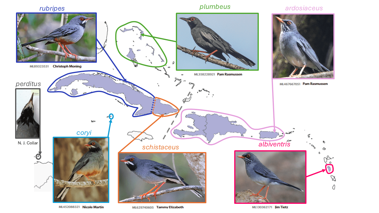 An unusual situation has been documented on Cozumel Island (Machkour-M’Rabet et al. 2023), in which the resident rufivertex (Ridgway, 1885), which breeds in uplands, is supplanted in mangroves by what the authors considered a new form that shows intermediacy in song, morphology, and genetics with adjacent mainland bryanti (Ridgway, 1873). A similar, though less well-documented, example of apparent abrupt intergradation between dissimilar taxa occurs on the Paraguana Peninsula of northern Venezuela (see Graphical Abstract under the Changes to Groups section).