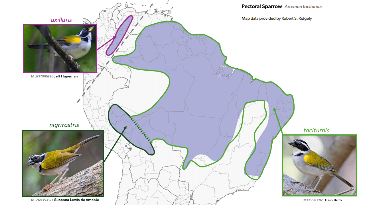 Initially described as a species, the yellow-billed taxon axillaris Sclater, 1855 of the foothills region of central Colombia and southwestern Venezuela was long considered a subspecies of the mainly Amazonian Arremon taciturnus Hermann, 1783. Paynter (1970, in Volume 13 of Peters’ Check-list), included not only axillaris but also southeastern Brazilian semitorquatus Swainson, 1838 in taciturnus. Much later franciscanus Raposo, 1997 was described from interior Minas Gerais and Bahia, and both it and semitorquatus are now considered distinct species.