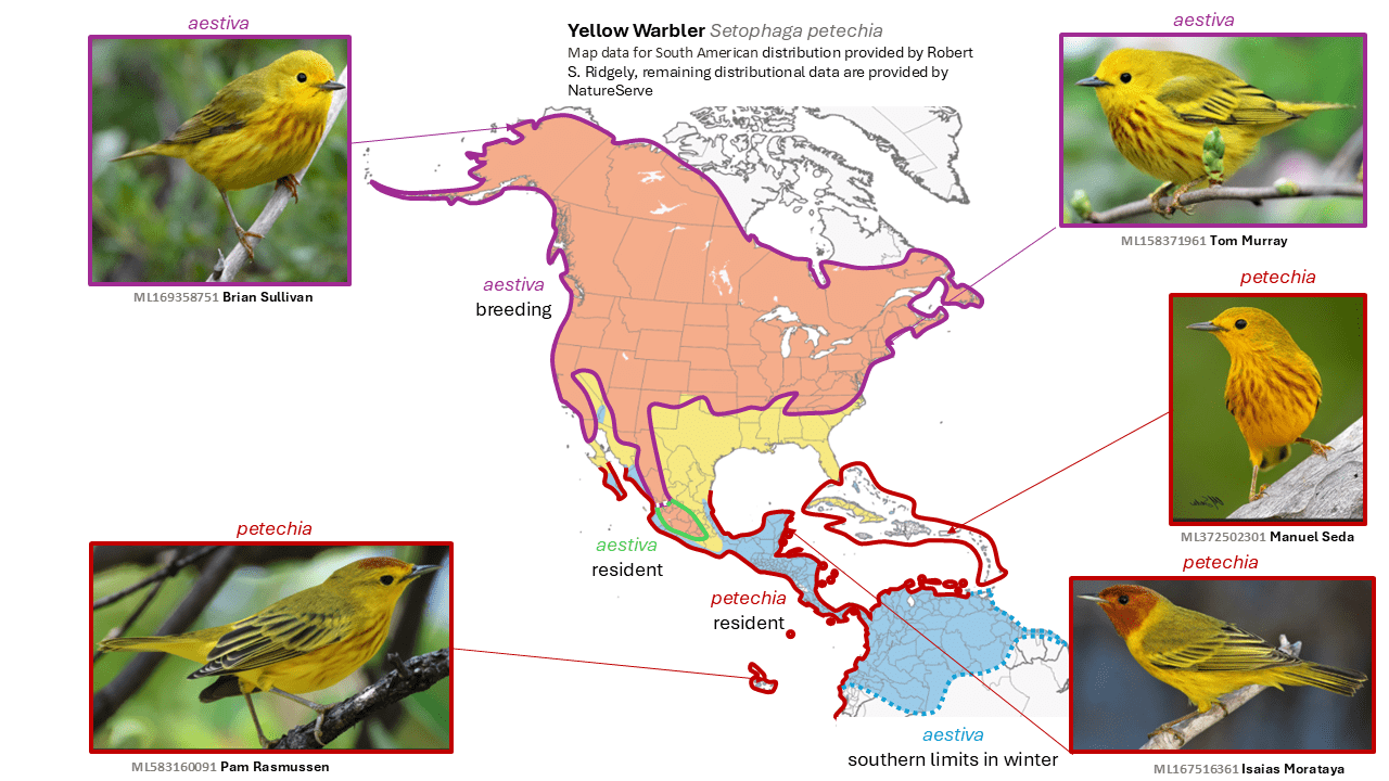 A 2003 proposal to SACC to split aestiva and petechia, failed, as have two proposals to NACC (in 2004 and 2018). Nevertheless, at the very least, it is certain that the aestiva and (broad) petechia groups are much more divergent in multiple aspects, especially genetic and ecological ones, than is any other parulid warbler species normally treated as a single species. The evidence for any further splits within the broad petechia group, however, is far less clear and compelling. Thus, petechia and aestiva are now considered full species by AviList Core Team (2025) based on their strong divergence in multiple ways.