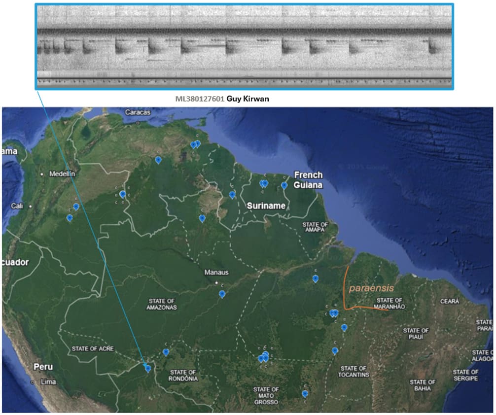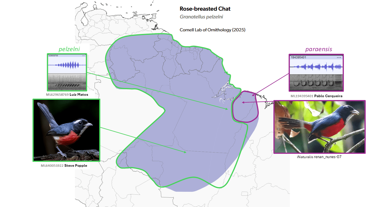 Additionally, mapping songs of pelzelni showed that, while somewhat variable, across major barriers and huge distances they are all comprised of the same type of simple, repeated series, unlike most songs thus far known for paraensis, which are complex and quite distinct. Further study is needed to understand vocal variation and potentially female song in paraensis (see SACC proposal), but a reconsideration of the matter by AviList in 2025 affirmed the decision to split paraensis.