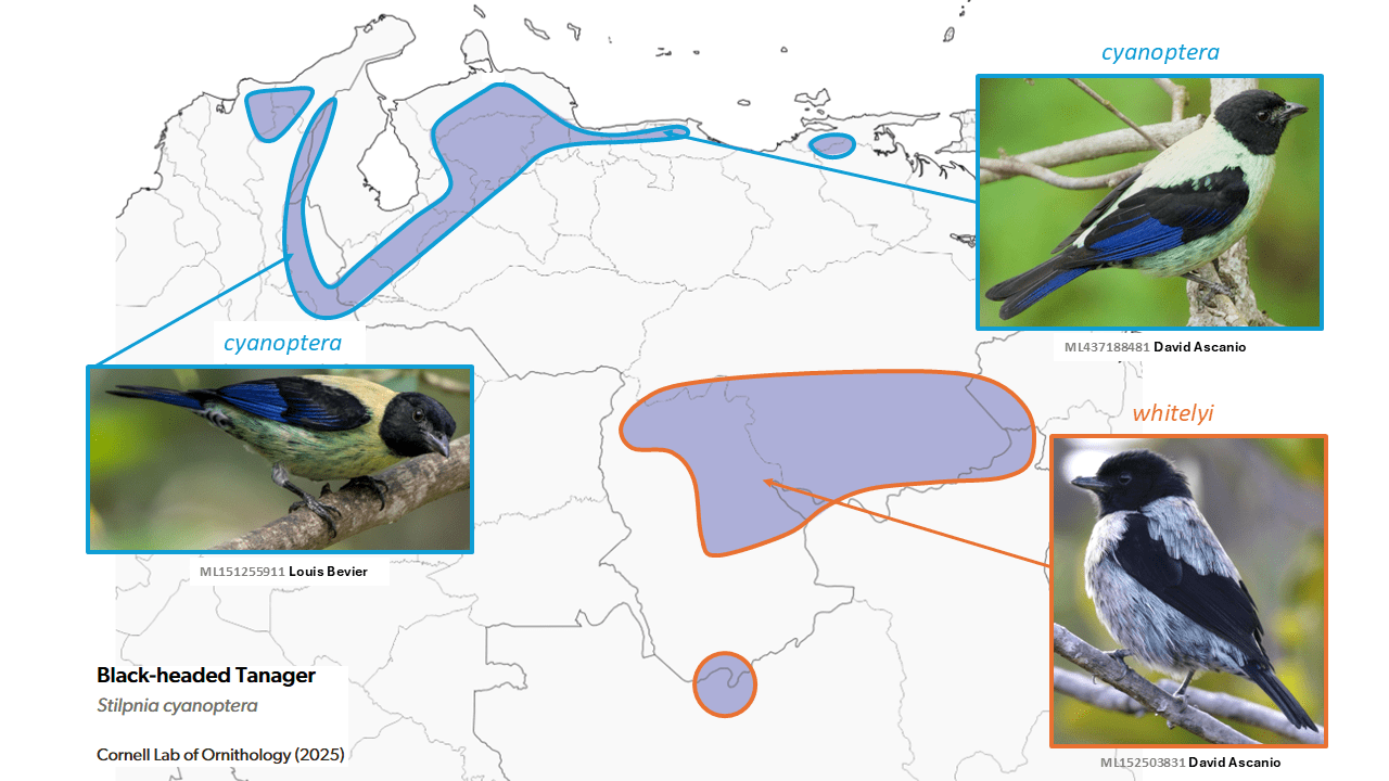 Two range-restricted tanager species of the mountains of Venezuela and adjacent countries, Stilpnia c. cyanoptera (Swainson, 1834) of the Santa Marta region eastward in coastal mountains of Venezuela, and whitelyi (Salvin & Godman, 1884) of the tepui region of southern Venezuela, far northern Brazil, and western Guyana, were each originally described as species, but were lumped at least by 1936 (Hellmayr 1936:174), and followed by Storer (1970, in Volume 13 of Peters’ Check-list) and thus most other authors. Since then, it has been repeatedly suggested that whitelyi might be best treated as specifically distinct (Ridgely and Tudor 1989, Hilty 2003, 2011, Dickinson and Christidis 2014, Restall et al. 2006), a treatment finally enacted by del Hoyo and Collar (2016) on the basis of the distinctive plumage of whitelyi, and followed by Hilty (2021). [Note that, while treated within Tangara, the name Tangara cyanoptera was preoccupied by Saltator cyanopterus Vieillot, 1817 (Dickinson and Christidis 2014), and thus Tangara argentea (Lafresnaye, 1843) was used, including by del Hoyo and Collar (2016). With the move of this clade of tanagers to Stilpnia, the name cyanoptera is once again in use.]