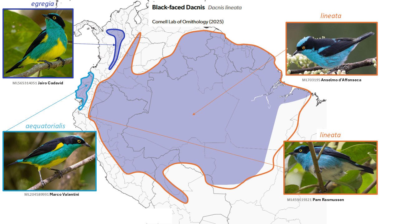 Originally described as two species of dacnis, lineata (Gmelin, 1789) of Amazonia and the Guianan Shield, and egregia Sclater, 1855 of the river valleys of western Colombia, a third taxon was, surprisingly (for the time), described as a subspecies of egregia, aequatorialis Berlepsch & Taczanowski, 1884, of far southwestern Colombia to far northwestern Peru. Hellmayr (1935) may have been the first to consider egregia and aequatorialis as subspecies of lineata, with the statement “[t]his bird, heretofore treated as a distinct species, is clearly but a geographical representative of the White-vented Dacnis [lineata], which it replaces west of the eastern Andes…”. Hellmayr’s (1935) treatment was followed by most other authors, including Storer (1970, in Volume 13 of Peters’ Check-list), until a two-way split was enacted by Ridgely and Greenfield (2001), after Ridgely and Tudor (1989) discussed the likelihood that they should be split. This treatment was that adopted by Hilty (2011, 2021), del Hoyo and Collar (2016), and the IOC-WBL (from v.3.1). Restall et al. (2006) opined that egregia (with aequatorialis) “appears to be a separate species”, but followed the single-species SACC treatment held at that time.