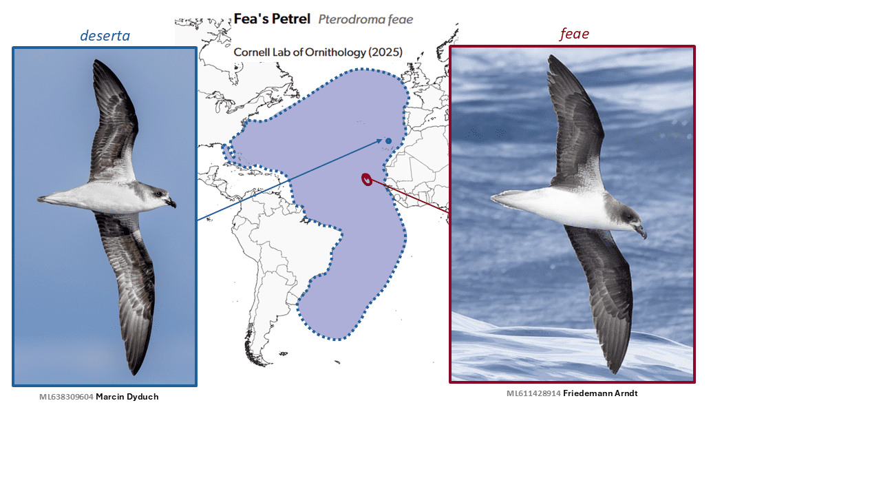 English names: Given fairly similar-sized breeding ranges of the two daughter species (though evidently not of non-breeding ranges) and the potential for confusion due to the fact that the name Fea’s Petrel has been very widely used to refer to what is now known to be deserta rather than feae, the use of the name Fea’s Petrel is discontinued here. The geographically clarifying names Cape Verde Petrel and Desertas Petrel are adopted for their breeding ranges (as in e.g. Howell and Zufelt 2019). Bugio Petrel, used by Ramírez et al. (2013), is also an apt name for deserta and highlights the importance of its sole breeding island, although it introduces yet another term for this already-confusing complex that does not mirror the specific epithet.