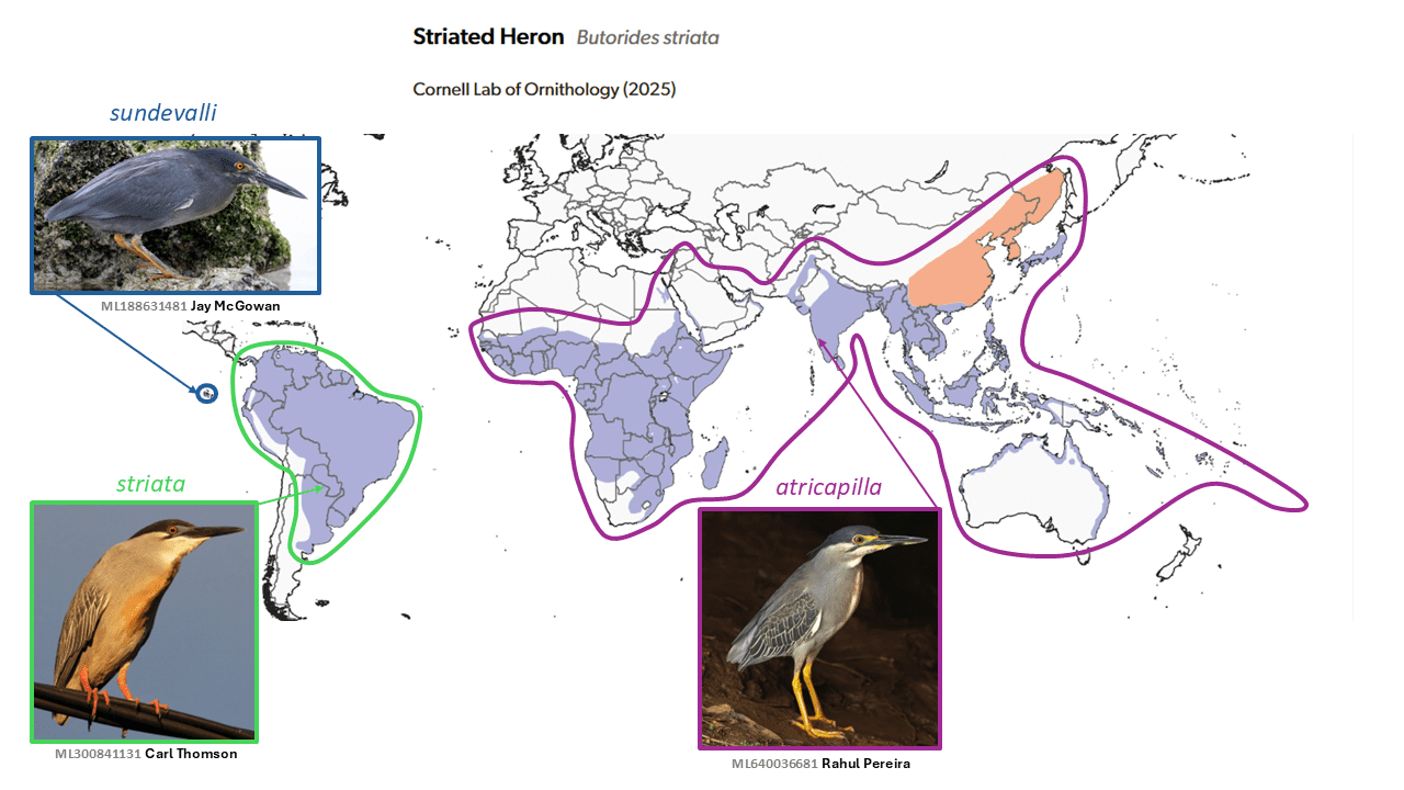 Mendales (2023) showed using genomic data that all New World Butorides taxa form a clade that is sister to that formed by all sampled Old World taxa, and therefore that the longstanding treatment is untenable. Given that Butorides virescens (Linnaeus, 1758) has long been considered a full species largely on the basis of apparent assortative mating (Hayes 2002, Hayes et al. 2013), a four-species treatment of the genus was adopted by AviList Core Team (2025), the most novel one being the split of mainly South American atricapilla (Afzelius, 1804), although this was originally described at the species level (long before the invention of subspecies). Further splits (for example a four-way split of Old World taxa into four species: African atricapilla, Arabian brevipes, Asian javanica, and Australasian macrorhyncha adopted by J. Boyd, among Old World taxa may prove to be justified, but sampling in Mendales (2023) was inadequate to resolve this issue.