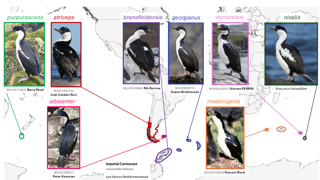 However, Calderon et al. (2014) found that Leucocarbo atriceps (including albiventer) shows little genetic structure relative to its more sedentary congener Magellanic Cormorant Leucocarbo magellanicus (Gmelin, 1789). Furthermore, a recent study shows that all the subantarctic taxa treated by Peters (1931) as comprising the three species atriceps, albiventer, and verrucosus, and including Antarctic bransfieldensis, are very closely related genetically (Rawlence et al. 2022). Thus they are all treated as conspecific by AviList Core Team (2025) and here. Genomic level work or comprehensive comparisons of behavior and vocalizations might however show previously undetected differentiation.