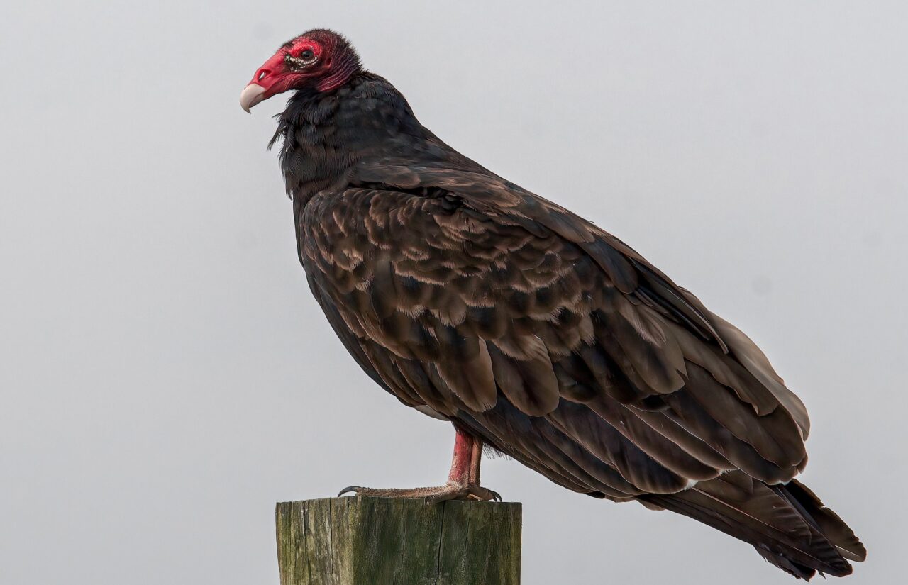 Large, dark, and hulking, the turkey vulture has a huge 6-foot wingspan and distinctive bald red head (the bare head keeps the birds from getting soiled when eating carrion). Turkey Vultures can be seen soaring alone or in groups, holding their wings in a V-shape and rocking back and forth. They use their excellent sense of smell to detect rotting flesh (their next meal), so Halloween zombies beware. Sniff out more info here.