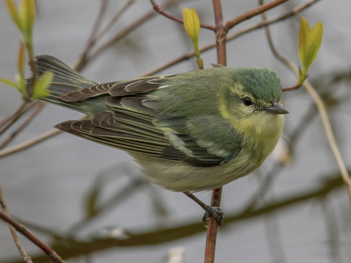 Cerulean Warblers are small blue birds with two white wingbars and horizontal posture. Males are sky-blue with dark streaking on the back and blue streaking on the sides. Bright white streaks and patches on the wings make them stand out no matter the habitat surrounding them. Females are bluish green with a yellow wash on the underside and whitish eyebrows. The cap of their head has the most bluish hue of their whole body as opposed to the males who are nearly entirely shades of blue. This warbler’s song is a buzzy series of notes that rise in pitch and end in a louder buzzy trill. Male Cerulean Warblers can usually be found singing from high perches in the canopy.