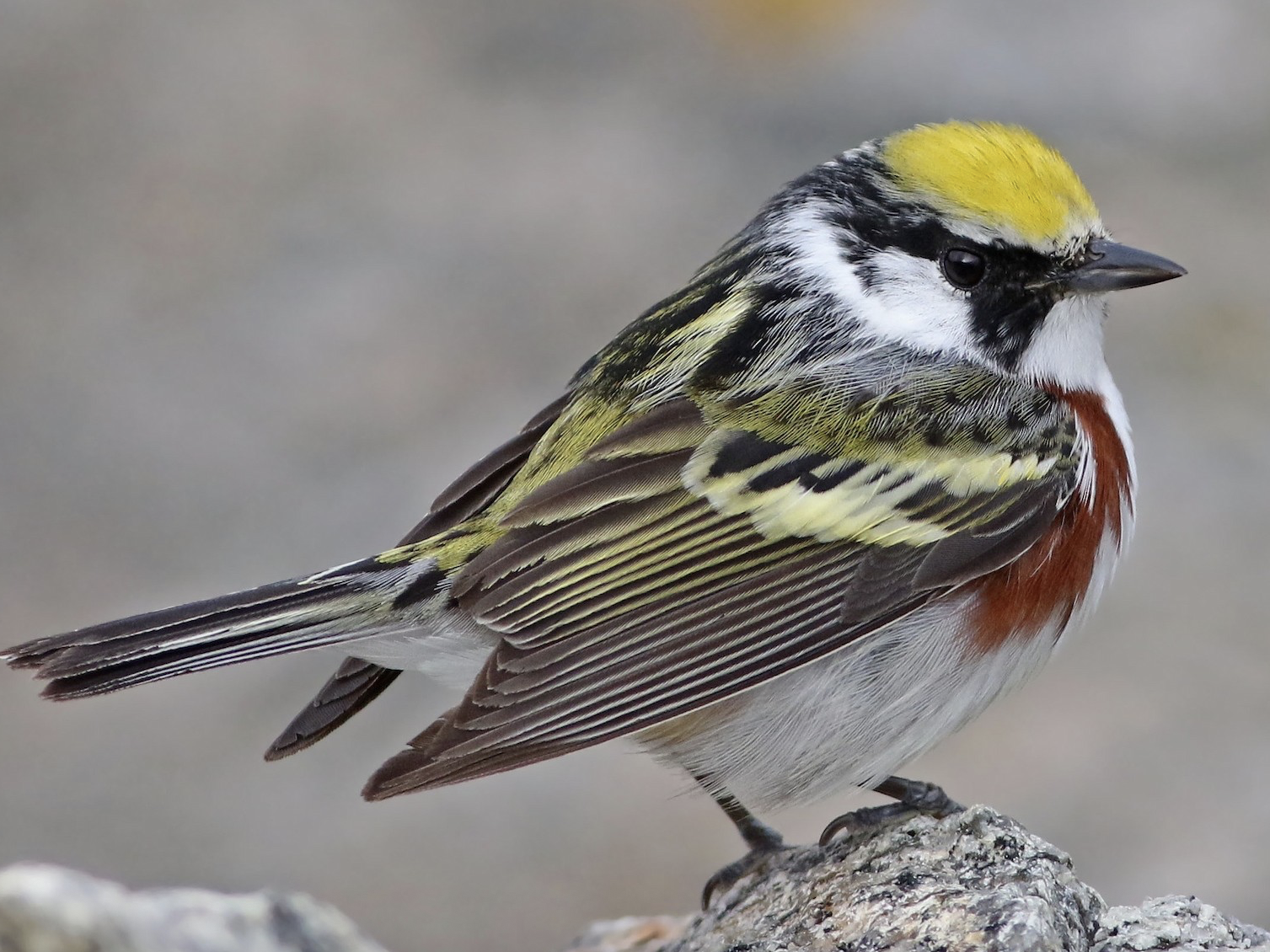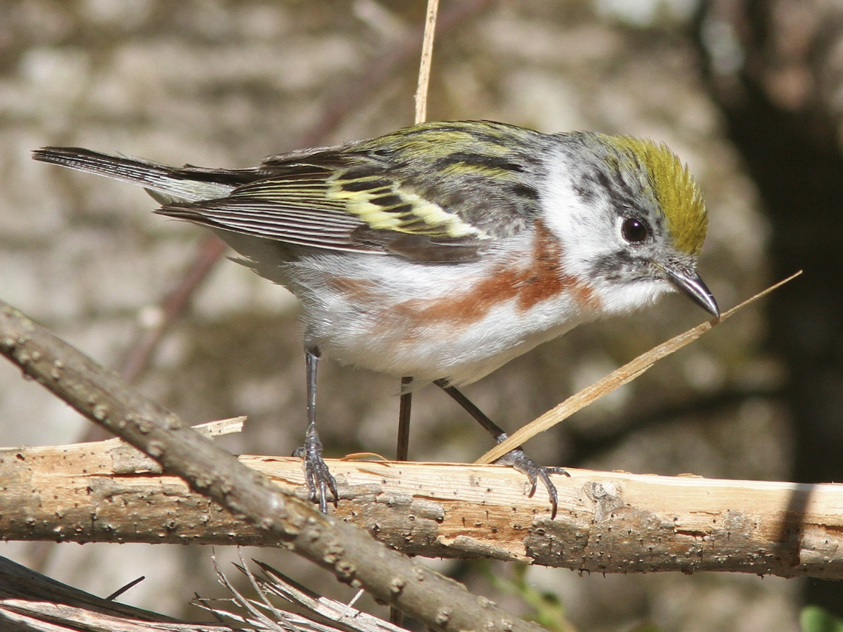 Chestnut-sided Warblers are small, stocky birds with stout beaks. Breeding males have light-gray underparts and yellow and gray streaked wings and upperparts. They have distinctive chestnut feathers at the base of wings, black masks, and vibrant yellow caps. Breeding females have similar plumage to male individuals with gray masks and darker caps. Immature Chestnut-sided Warblers lack the black mask and have smaller or absent chestnut plumage. Male Chestnut-sided Warblers give two songs, one described as a Pleased-pleased-pleased-to-meetcha! or I-wish-to-meet-Miss-Beecher! The song has an accented ending, indicated by the exclamation point. The other sounds similar to the first, but lacks the accented ending, making it sound similar to a typical Yellow Warbler song. The accented song is heard most often in the spring with males using it to attract females then switching to the unaccented song later in the season.