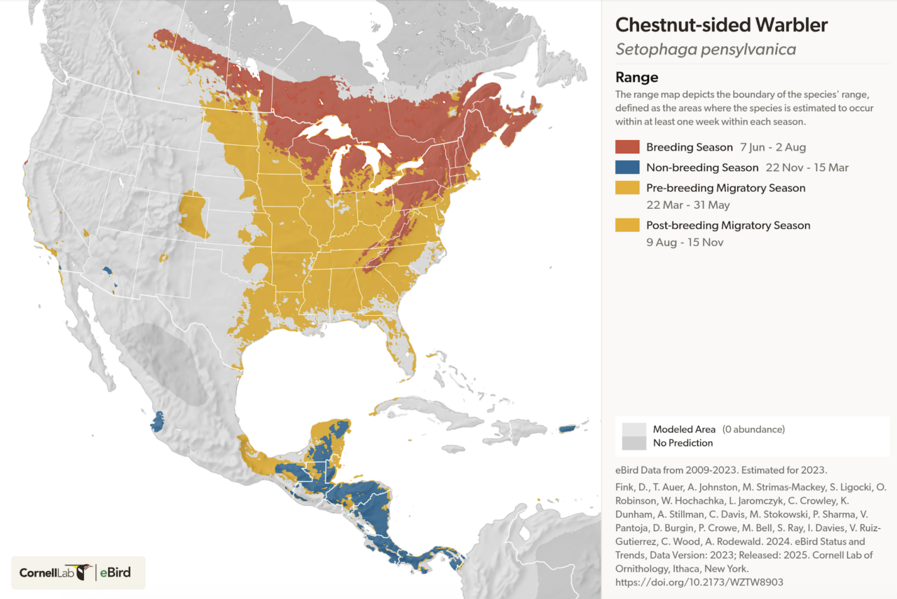 The breeding range of the Chestnut-sided Warbler spans from southern Canada through the Appalachian Mountains to Georgia. They migrate through the central and eastern U.S. with their wintering range beginning in southern Mexico on the Atlantic Slope through Panama, occasionally wintering in the eastern Caribbean.