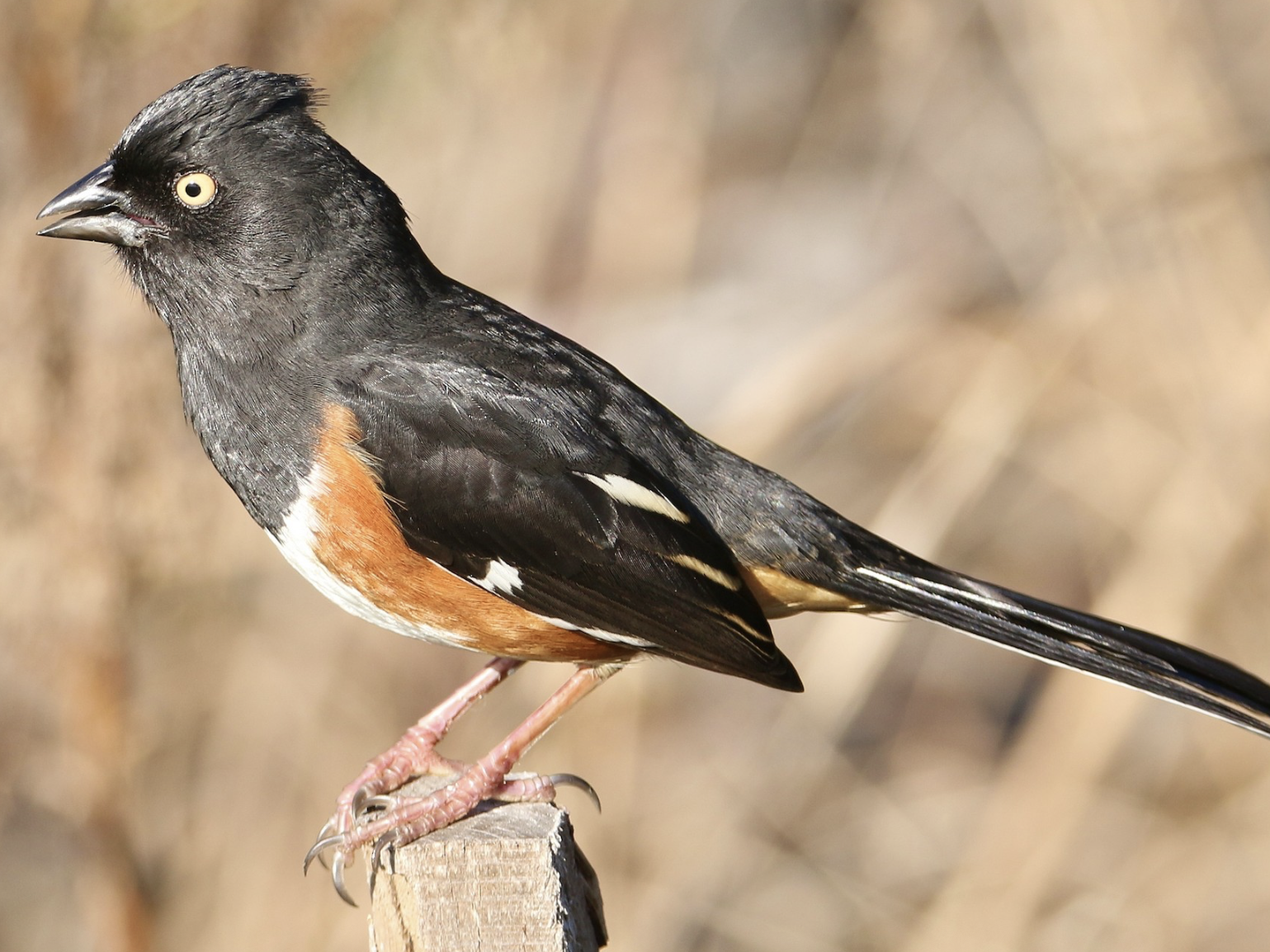Eastern Towhees are medium-sized birds with thick bills and long tails. Adult males have black upperparts, throats, heads, and wings, with rufous sides and white bellies, and white tail and wing corners. Adult females are patterned similarly to males, but with brown upperparts, throats, heads, and wings rather than black. In southern American populations, individuals have pale white eyes rather than dark or reddish eyes. Juveniles have similar coloration to females but lack the rufous sides, instead sporting brown-streaked bellies. Male Eastern Towhees give a drink-your-tea! song with a sharp, metallic starting note and a musical trill final note. Sometimes the song will begin with multiple starting notes. Their most common call is given by male and female individuals and consists of a two-parted, rising chewink, tow-hee, or joree. The call varies in tone based on geography and can range from clear whistles to hoarse or nasal tones. This call is most often an alarm call.
