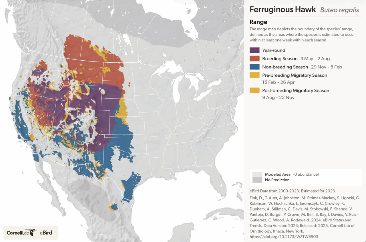 Ferruginous Hawks thrive in open, arid landscapes, particularly grasslands and shrub-steppe habitats, including pastures, hayland, and croplands.They avoid dense forests and prefer areas with short vegetation, often nesting on solitary trees, utility structures, or near the ground on hillsides or river cutbanks. The Ferruginous Hawk inhabits semiarid to arid western plains and intermountain regions. It occupies open country with scattered trees, primarily prairies, plains, and badlands.