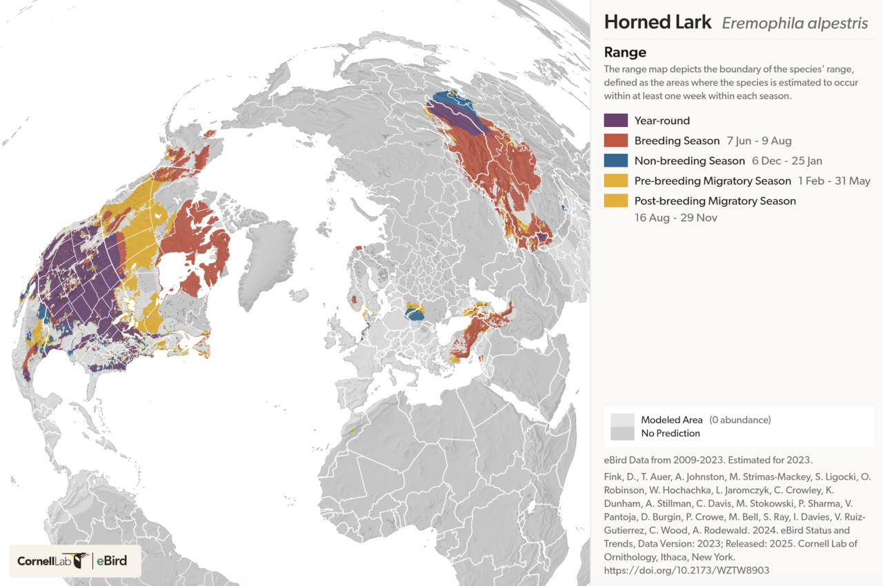 Horned Larks breed throughout a large portion of North America generally from Arctic islands to the highlands of Mexico. They generally reside outside of Canada’s interior, preferring coastal, mountainous, or desert environments. During the winter season the northernmost populations move south into the U.S. and Mexico.