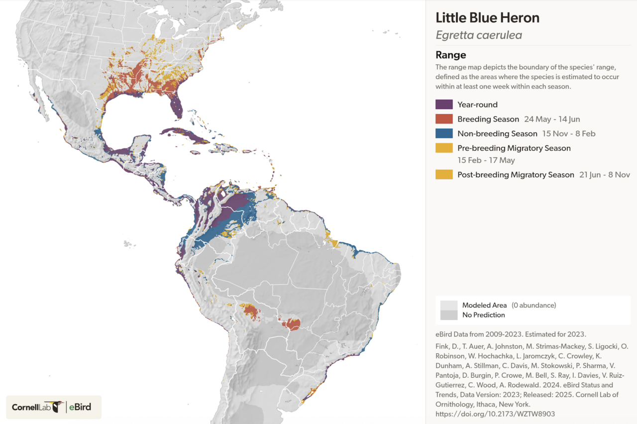 The Little Blue Heron is a resident to medium-distance migrant. Year-round residents inhabit The Gulf Coast, The Caribbean, and parts of Central and South America. These residents only disperse short distances. Birds that breed in the interior southeast of the United States will migrate to the areas occupied by year-round residents, with a larger population in Central America. Links to full maps can be found below.