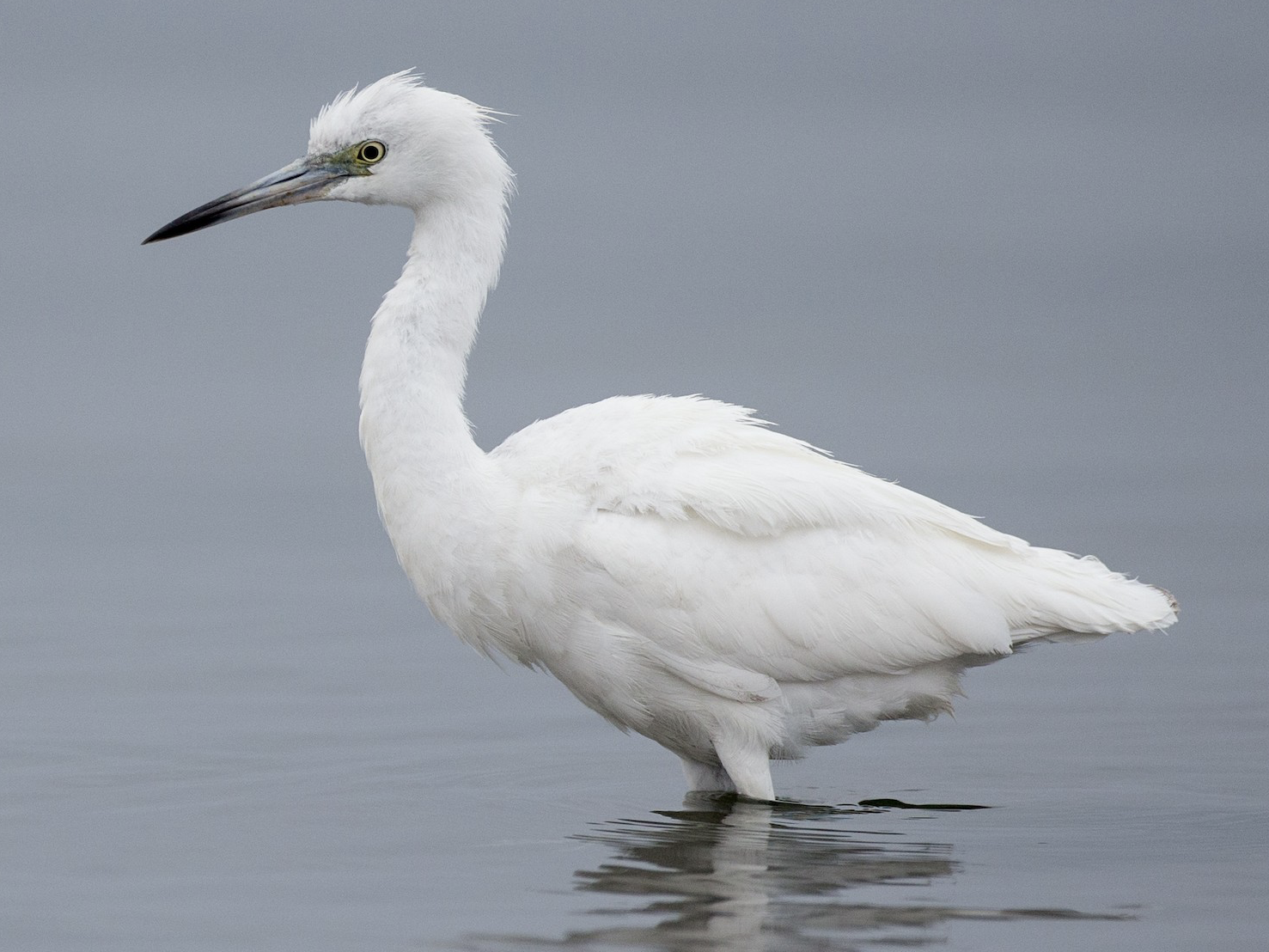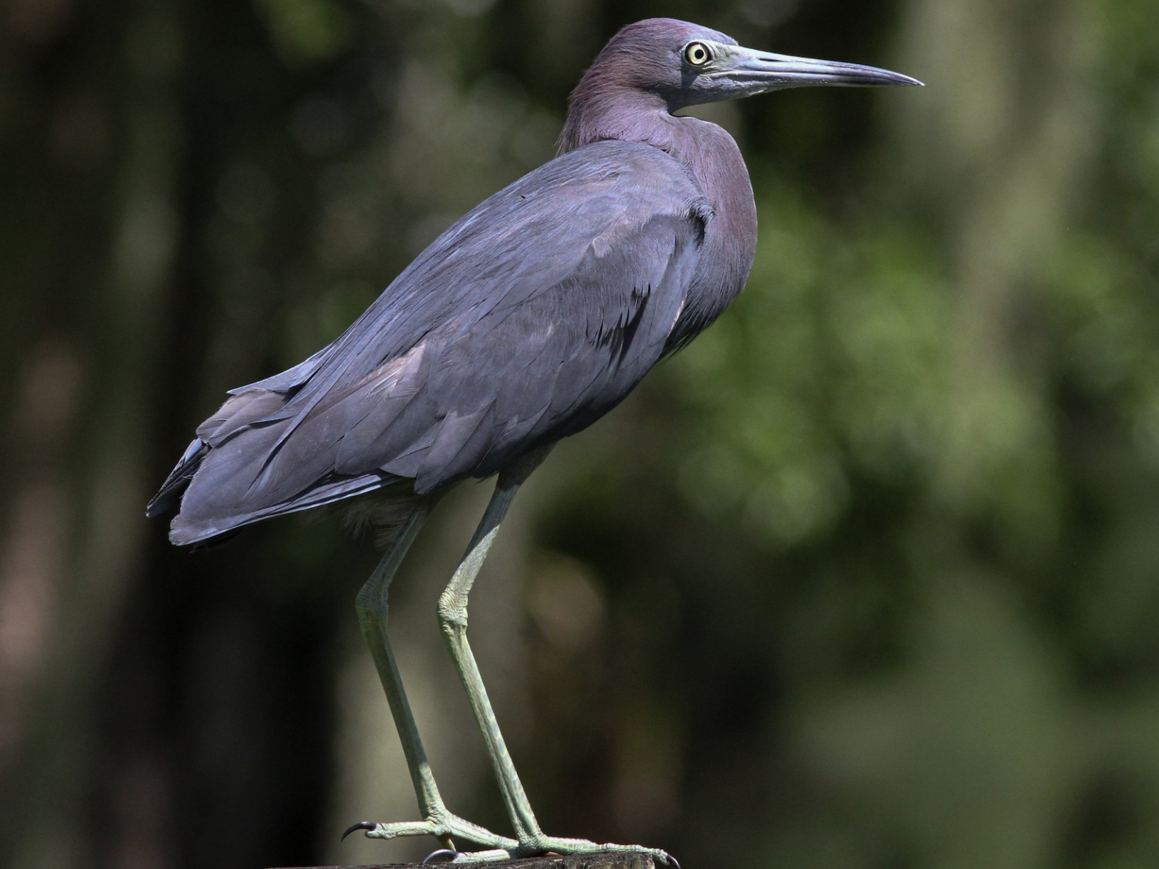 The Little Blue Heron is a small heron with dark blue and plum-purple plumage with a bicolored bill. Both sexes have similar plumage. Juveniles are almost entirely white. After their first year, they may appear pied as they transition to their adult plumage.