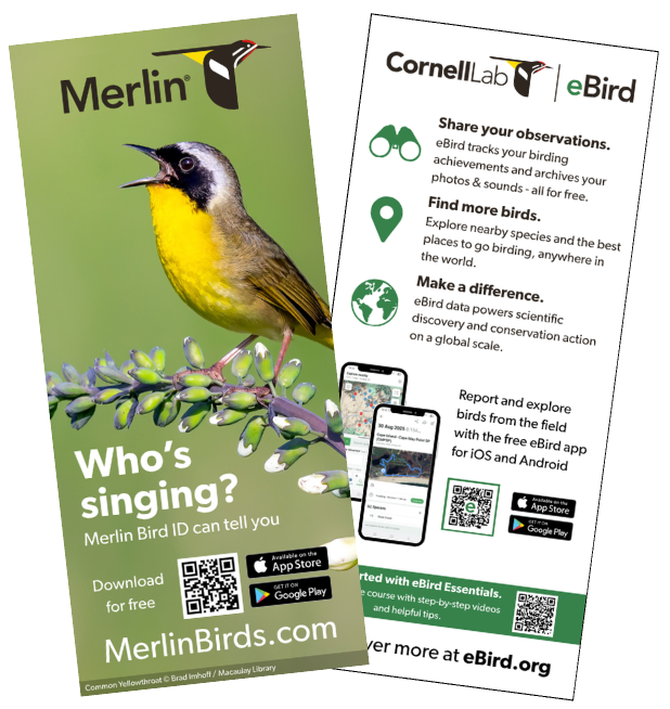 Click the buttons below to download Merlin Bird ID and access posters, rack cards, bookmarks, and QR codes to make it easy to share Merlin with your community.