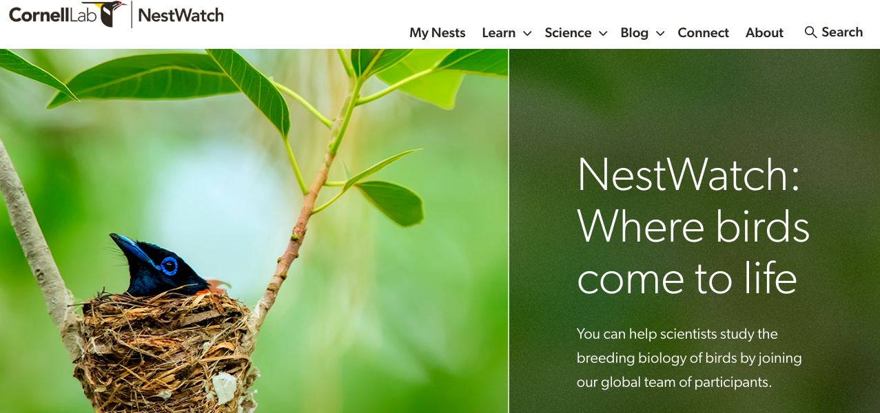 NestWatch, developed by the Cornell Lab of Ornithology, is a nationwide nest-monitoring program designed to track status and trends in the reproductive biology of birds, including when nesting occurs, number of eggs laid, how many eggs hatch, and how many hatchlings survive.