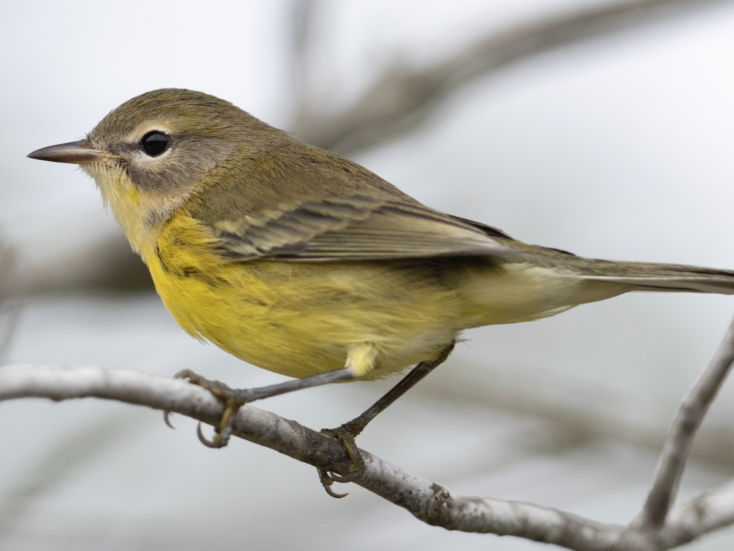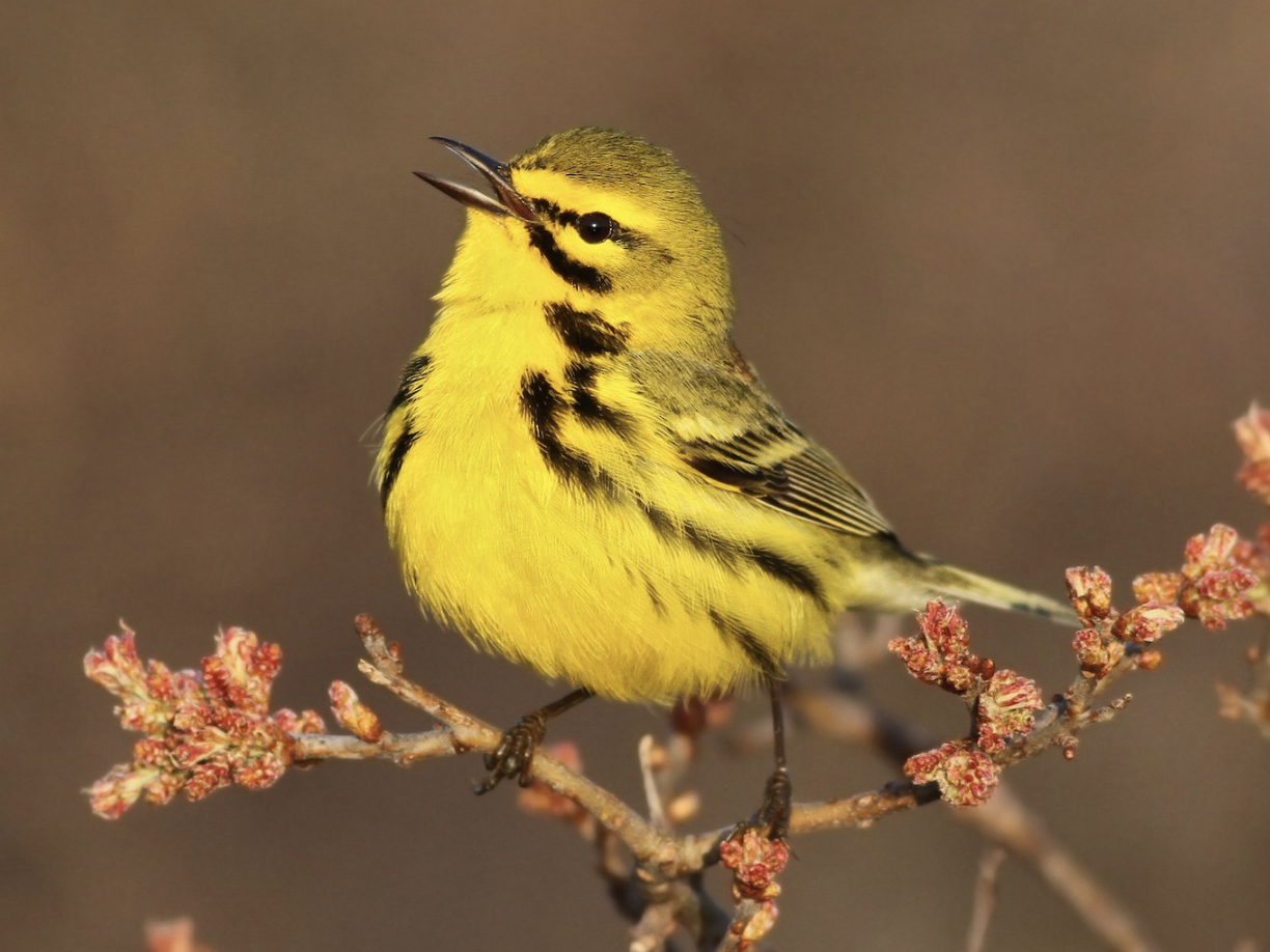 The Prairie Warbler is a small yellow warbler with black streaks on its side. It is olive-gray on the upper part of the body and wings. Male Prairie Warblers are more vibrant than females and immature Prairie Warblers (which have olive streaks). A Prairie Warbler’s song is made up of ascending sudden jerky buzzing notes often transcribed as a zee noise. Prairie Warblers sing two song types, an “A Song” and a “B Song.” The A Song is sung by males for courtship, whereas the B Song is used to deter other males from their territory—both songs are similar in sound, but are distinct. The A Song is made up of ascending sudden jerky buzzing notes often transcribed as a zee noise. There are usually 15 of these zee notes, with the pitch ascending so high that humans are unable to hear it. The B Song of the Prairie Warbler is harder to categorize as it’s diverse and not always the same from individual to individual. There are often two parts to this song with the first part (usually) being several long clear notes and the second part being several short raspy notes.
