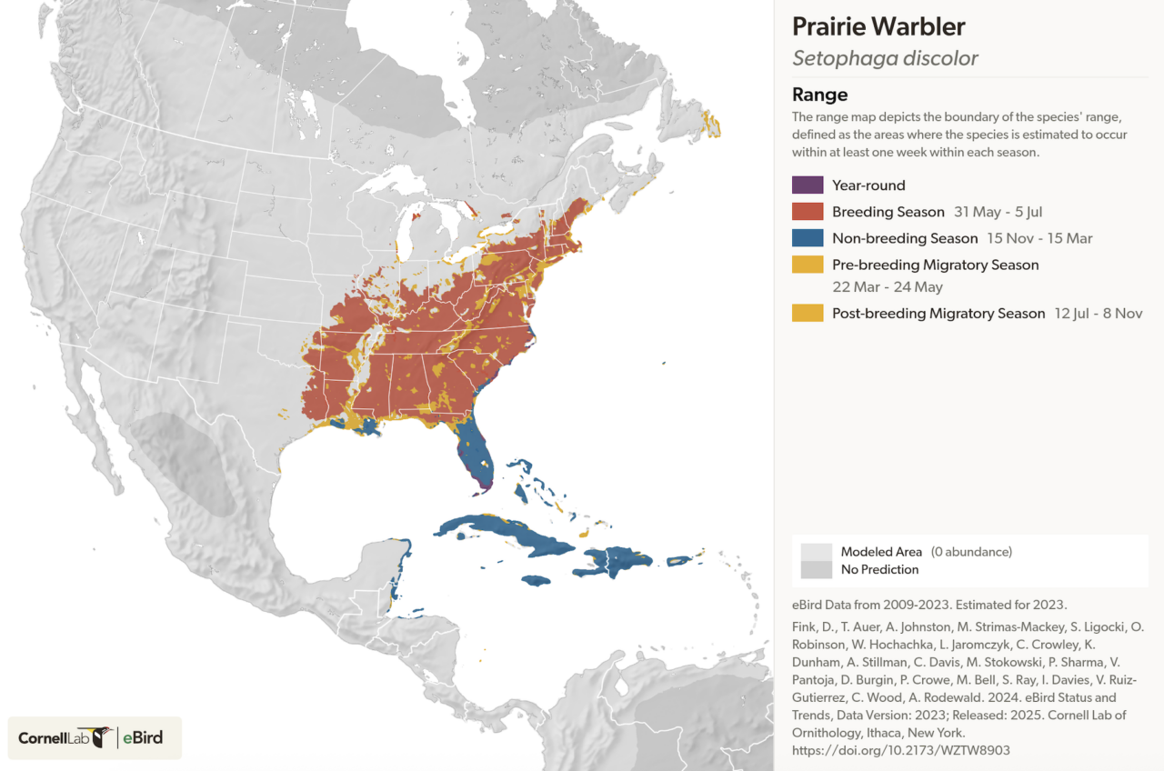 Prairie Warblers are medium-distance migrators with their full range spanning from the Caribbean Islands to the Northeast U.S. Prairie Warblers are found year-round in most of Florida with their breeding range reaching from Eastern Texas to Southern Maine. Near this breeding range, there is a small patch of migration-only range that encompasses many borders of Southern and Midwestern states—notably the southern half of the Mississippi River. Prairie Warblers also have an area of non-breeding habitat in the Caribbean Islands and small sections of the surrounding coast in Middle and South America.