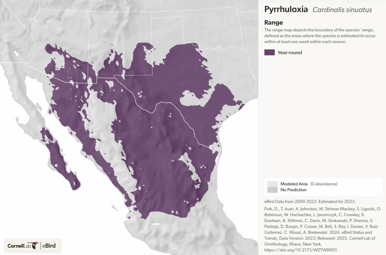 Pyrrhuloxias thrive in arid, brushy habitats, particularly those with mesquite and acacia scrub. They are commonly found in desert scrub, dry grasslands, and open mesquite forests. They prefer areas with dense brush-like groves, desert washes, and canyons, but can also be found in more open areas during winter. They favor spaces with dense vegetation in order to forage, hide, and build nests within. If their preferred vegetation is nearby, they can also be spotted in residential areas or agricultural fields.