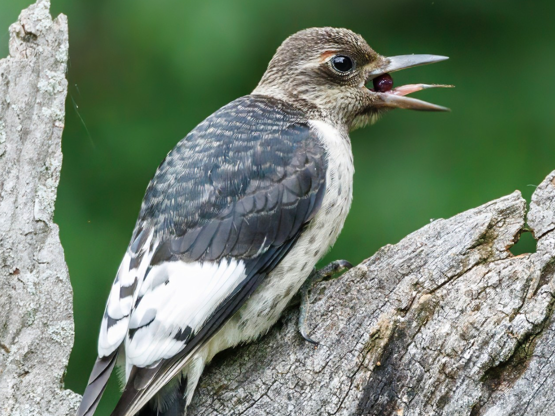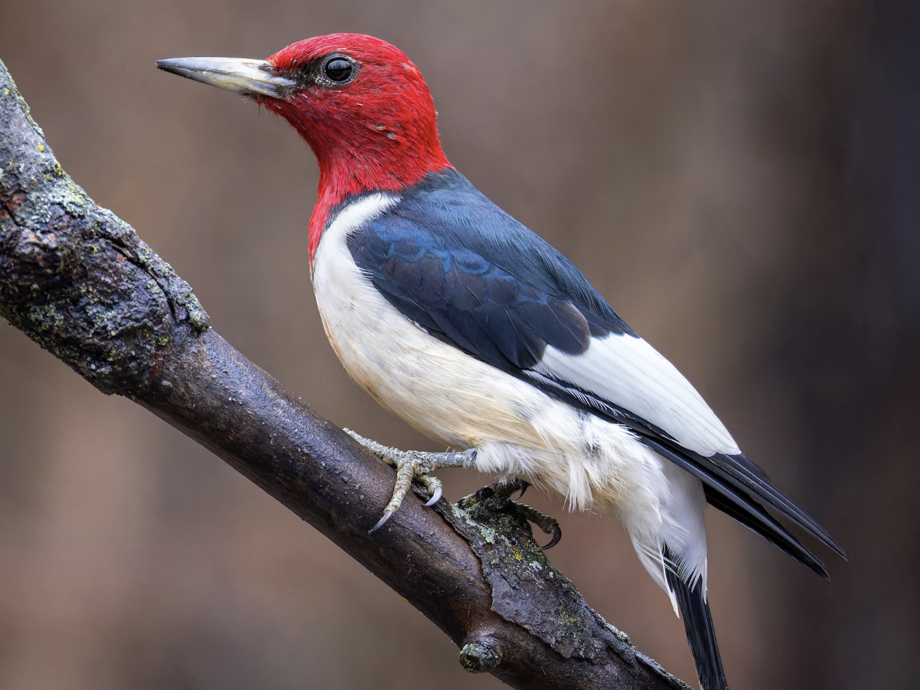 The Red-headed Woodpecker is a medium-sized woodpecker. Adults have a crimson red head with a white breast and black wings. The secondary feathers of the Red-headed Woodpecker are white, creating a white patch on their black wings. Juvenile Red-headed Woodpeckers have brown heads with an overall more dingy and brown appearance than adults.
