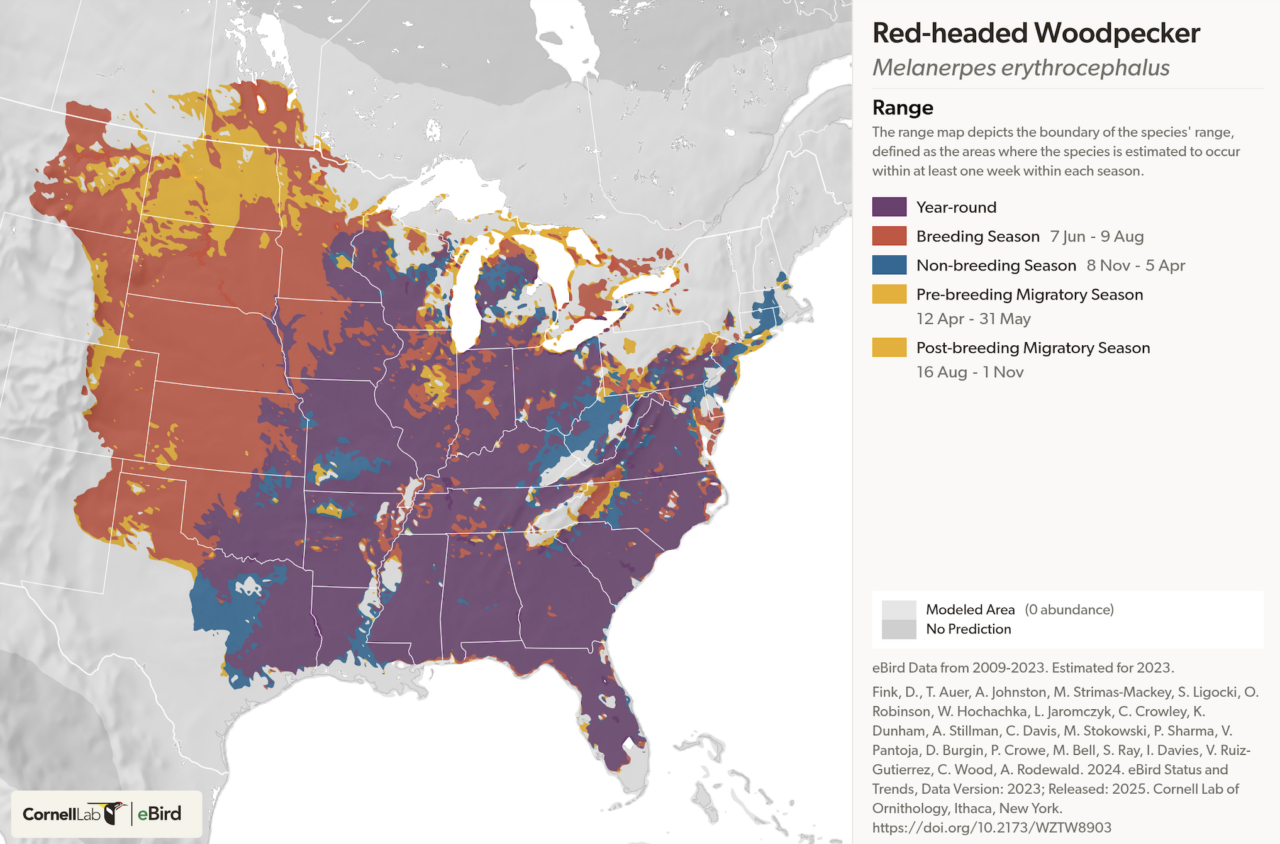 The range of the Red-headed Woodpecker extends from the southern United States with its westernmost breeding range ending at the Rocky Mountains. The eastern end of its range extends into New York and Vermont during the breeding season. The breeding range at its furthest north barely dips into Canada, making its range almost exclusively in the United States. Red-headed Woodpeckers are irregular partial or short-distance migrators. They will often leave the western and northern parts of their range in winter. Migration heavily depends on acorn and beech nut crops. In fall migration, they move during the day; during spring migration, they move at night.